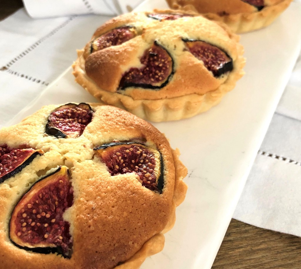 I put about two tablespoons of frangipane per tartlet (it does raise in the oven), then top up with thin slices of fig (the tartness and texture of the fig slices works well with the smooth almond filling), and back into the oven at 180°C for about 20 to 30 minutes. If you’re making a big tart count at least 45 minutes for baking.