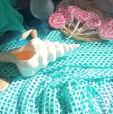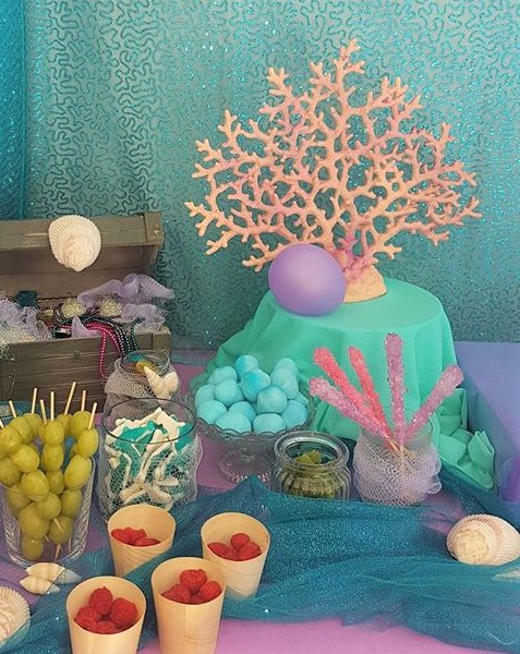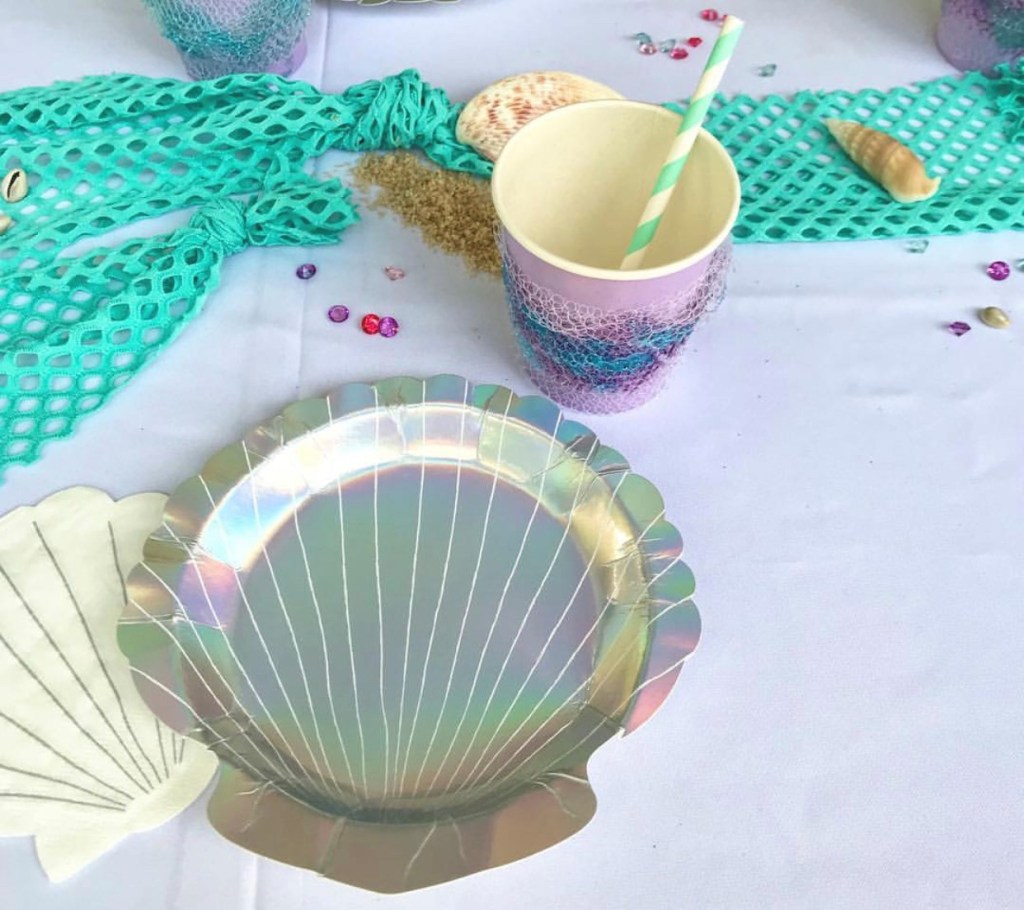 I started off by stocking on fabrics from one of my favourite stores in Johannesburg, Chamdor: I wanted to create a girlie underwater scene, with shimmery tulle and coral sequin details, and then found a gorgeous netting that looked fun to add interest to the tables. Then I moved on to Party Spot to find some basics. I bought some round paper lantern that got turned into floating jelly fish with the help of some ribbons, shower roses and my faithful glue gun. That’s also where I found the pretty plain vanilla lilac paper cups that also got glammed up with some netting left over from the shower roses and some glitter glue. I dug out the little treasure chest we had for Little Monsieur’s Pirate birthday a few years ago, and filled it with seashells, pearl strings, and jewels.
